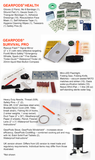 Included in the kit are Medium and Large GearPods Containers, GearPods First Aid Kit and a GearPods Survival Kit - including cup, stove, windshield and a solid fuel burner.