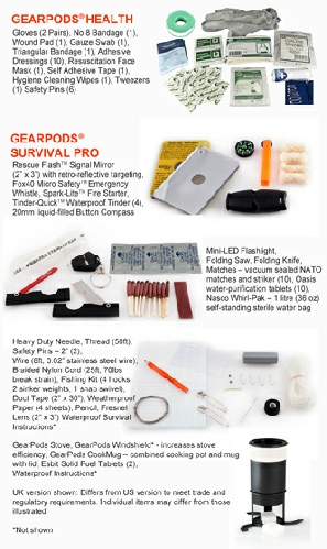 GearPods Containers, GearPods First Aid Kit, GearPods Adventure Tarp and a GearPods Survival Kit - including cup, stove, windshield